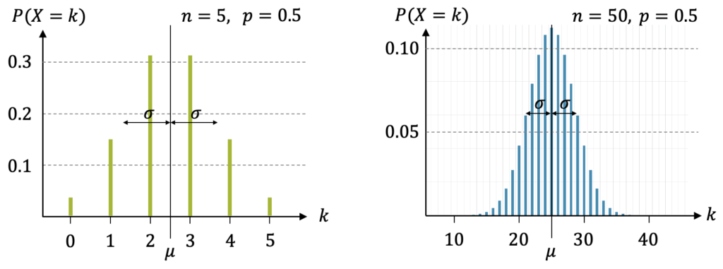 Nachfolgend ist die Binomialverteilung für den fünffachen Münzwurf dargestellt (grün, links). Rechts (in blau) ist die Binomialverteilung für den 50-fachen Münzwurf dargestellt.