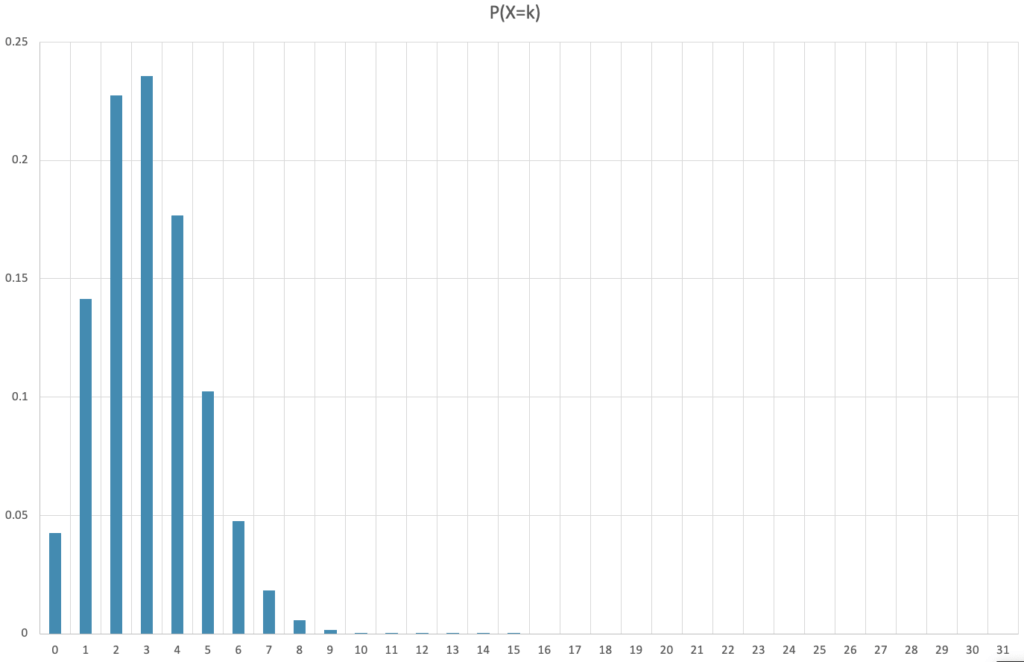 \[ P(X>3) = 0.002’262 + 0.000’145 + 0.000’005 = 0.002’413 = \underline{0.2\%} \]