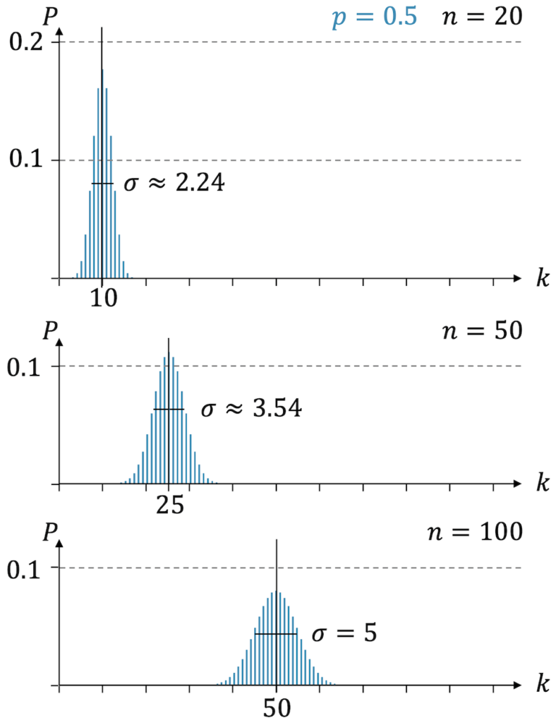 Für 50 und 100 Würfe erhalten wir \(\sigma \approx 3.54\) bzw. \(\sigma = 5\). Warum ist das so? Mit der grösseren Anzahl Würfe gibt es eine grössere mögliche Streuung der Ergebnisse, denn es handelt sich immer noch um ein Zufallsexperiment. Je öfter wir dieses durchführen, desto grösser wird die Anzahl möglicher Abweichungen vom theoretischen Wert, dem Erwartungswert. Die Abweichungen sind aber, je grösser dieses sind, desto unwahrscheinlicher.