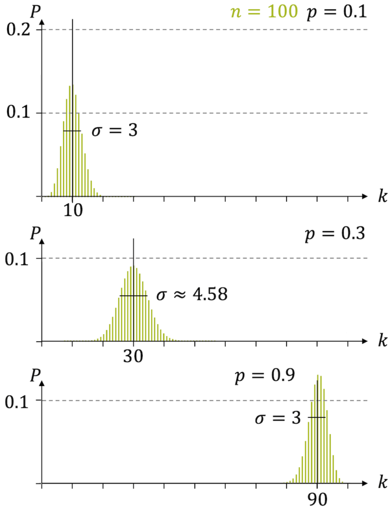 Die Standardabweichung ist für die beiden spiegelsymmetrischen Fälle natürlich gleich gross (\(\sigma = 3\)). Wäre die eine Streuung grösser als die andere, dann wären die beiden Glockenformen nicht gleich breit und somit auch nicht spiegelsymmetrisch. Für die Wahrscheinlichkeit \(p=0.3\) erhalten wir eine etwas grössere Standardabweichung. Das können wir auch erklären. Bei extremen Fällen (wie \(p=0.1\) oder \(p=0.9\)), wo Treffer bzw. Niete sehr unwahrscheinlich sind, streuen die Werte nicht gross. Ein unwahrscheinlicher Treffer wird sehr selten vorkommen und somit bei \(n=100\) einen kleinen Erwartungswert ergeben. Es wird auch nur wenige Abweichungen davon geben, weil die Abweichungen alle von der sehr niedrigen Wahrscheinlichkeit eines weiteren Treffers betroffen sind.