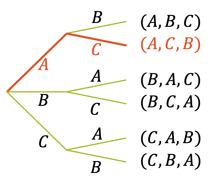 \[ (A,B,C),\;\; (A,C,B),\;\; (B,A,C),\;\; (B,C,A),\;\; (C,A,B),\;\; (C,B,A) \]