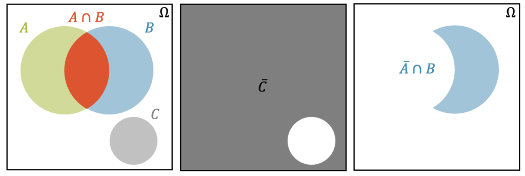 In der Mitte sehen wir das grau markierte Gegenereignis von \(C\), das wir mit einem Querstrich markieren. Es ist die Menge aller möglichen Ergebnisse, jedoch ohne die Ergebnisse von \(C\), die ausgeschlossen sein sollen.