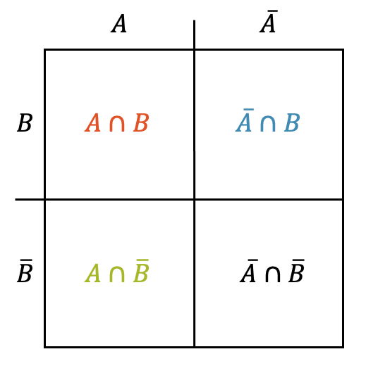 Mit einer Vierfeldertafel werden zwei Ereignisse in Form einer Tabelle einander gegenübergestellt. Die vier Felder entsprechen den Schnittmengen der beiden Mengen bzw. derer Gegenereignisse.