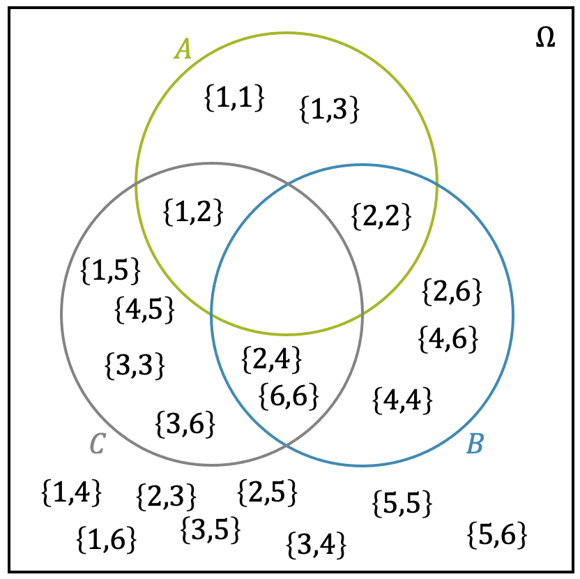 Wir können die Richtigkeit schnell überprüfen, indem wir schauen, ob z.B. die Summe tatsächlich maximal 4 beträgt für die Elementarereignisse in \(A\). In \(B\) sollten nur gerade Augenzahlen stehen, was wir auch mit einem Blick bestätigen können. Schliesslich enthält der Kreis \(C\) alle Elementarereignisse, deren Summe eine Dreierzahl ist. Auch das ist schnell überprüft.
