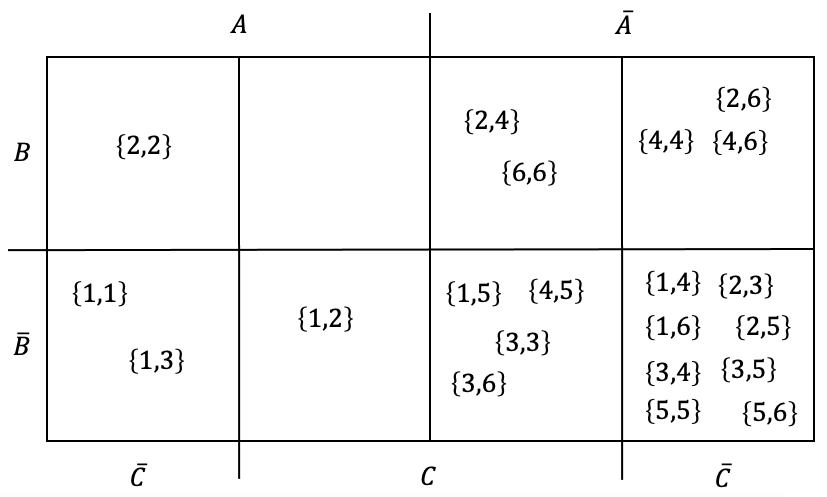 Als nächstes machen wir eine Tabelle mit allen möglichen Elementarereignissen und setzen immer ein Kreuz, wenn die Bedingung für das entsprechende Ereignis \(A\), \(B\) oder \(C\) erfüllt ist. Die Schnittmenge \(\overline{A} \cap \overline{B} \cap \overline{C}\) steht für alle Elementarereignis, die weder \(A\), \(B\), noch \(C\) erfüllen: