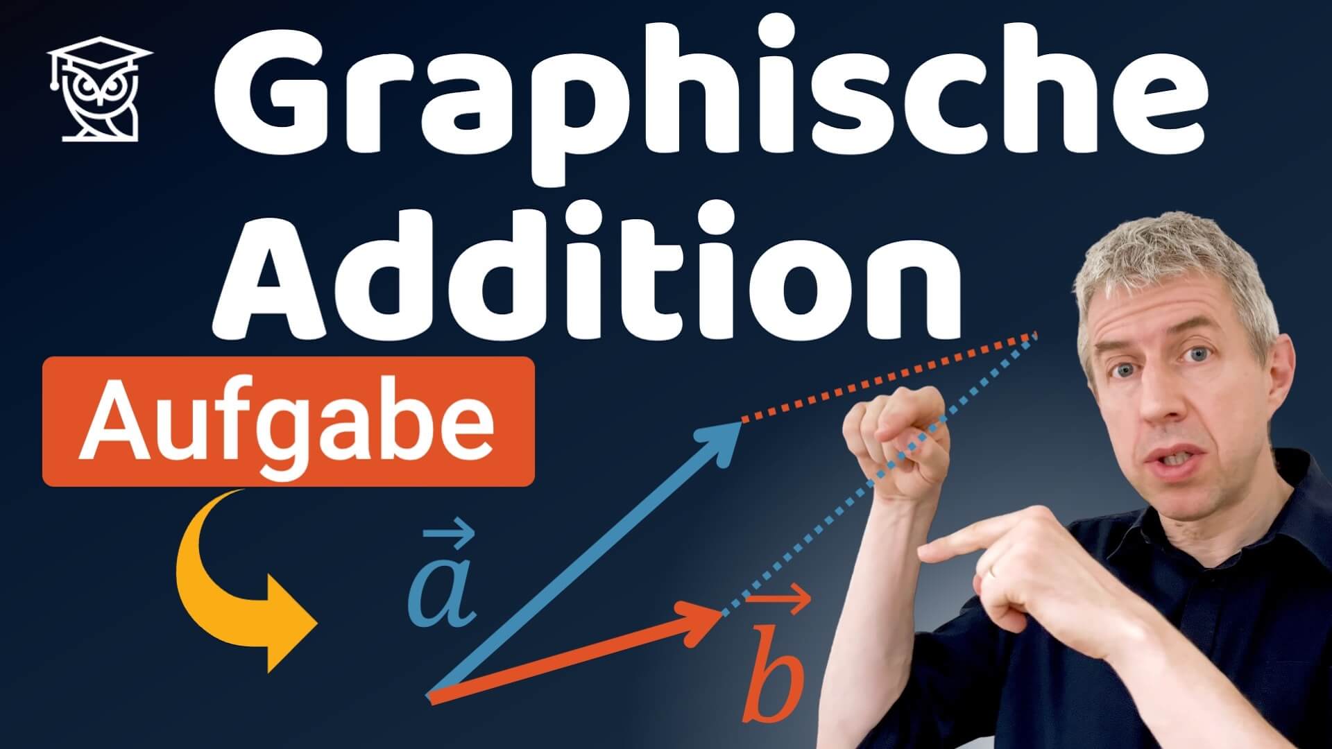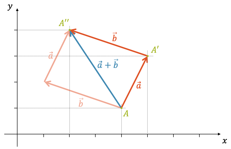 Nun schauen wir uns die Addition im zweidimensionalen Koordinatensystem an. Der erste Vektor \(\vec{a}\) bildet \(A\) auf \(A’\) ab, der zweite Vektor \(b\) bildet \(A’\) auf \(A”\) ab. Die Summe der beiden Vektoren \((\vec{a}+\vec{b})\) ist somit eine Abbildung von \(A\) direkt auf \(A”\).