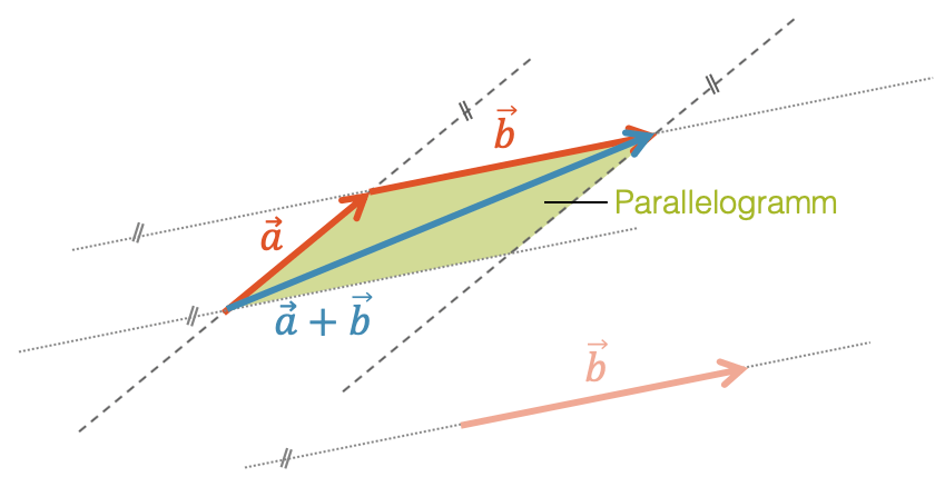 Die beiden Vektoren \(\vec{a}\) und \(\vec{b}\) bilden ein Parallelogramm. Der Summenvektor \((\vec{a} + \vec{b})\) ist die Diagonale des Parallelogramms.