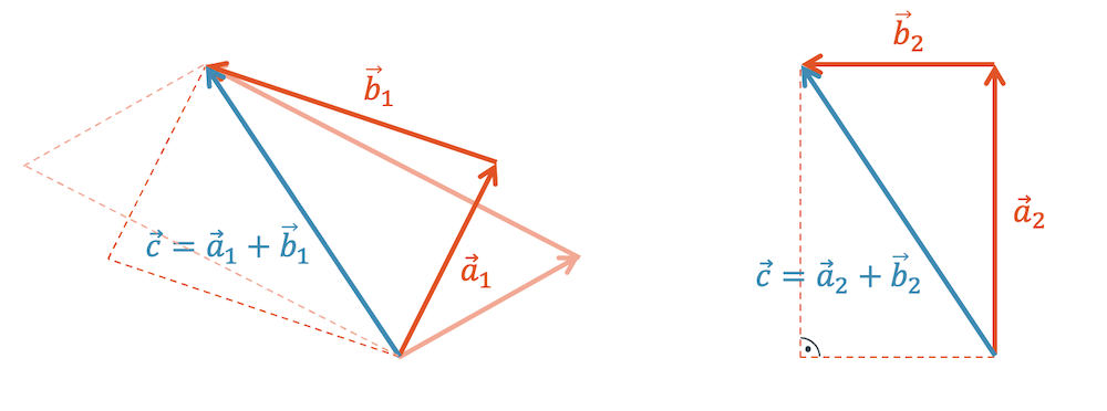 Wir können zu einem Vektor, z.B. \(\vec{c}\), immer ein Paar von zwei Vektoren finden, die wir jetzt \(\vec{a}\) und \(\vec{b}\) nennen. Addieren wir die beiden Vektoren \(\vec{a}\) und \(\vec{b}\), kriegen wir den Summenvektor \(\vec{c}\):