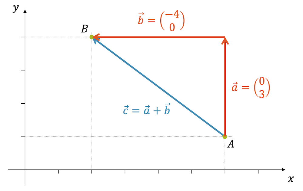\[ \vec{a} + \vec{b} = \begin{pmatrix} 0 \\ 3 \end{pmatrix} + \begin{pmatrix} -4 \\ 0 \end{pmatrix} = \begin{pmatrix} 0-4 \\ 3+0 \end{pmatrix} \]