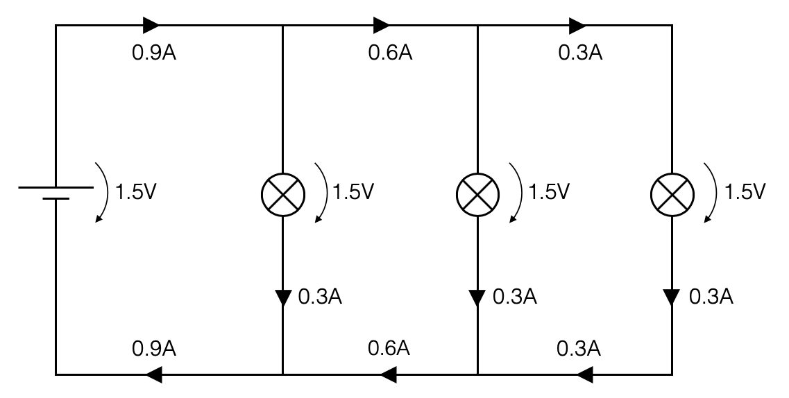 Da die elektrische Ladung eine Erhaltungsgrösse ist, addieren sich die Ströme der drei Lampen zu einem dreifachen Strom von \(0.9\,\text{A}\) aus der Batterie heraus und natürlich genau gleich gross wieder zu ihr zurück.