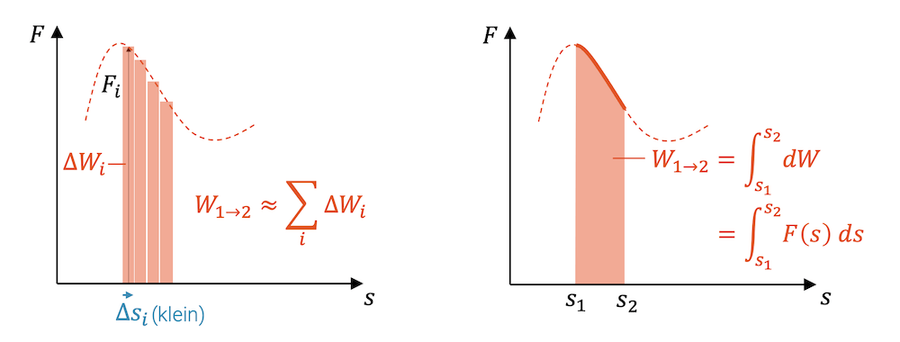 Diese Flächenstücke entsprechen kleinsten Mengen von Energie \(\Delta W_i\). Wenn wir sie alle summieren, kriegen wir die Arbeit, die durch die Kraft verrichtet wird: