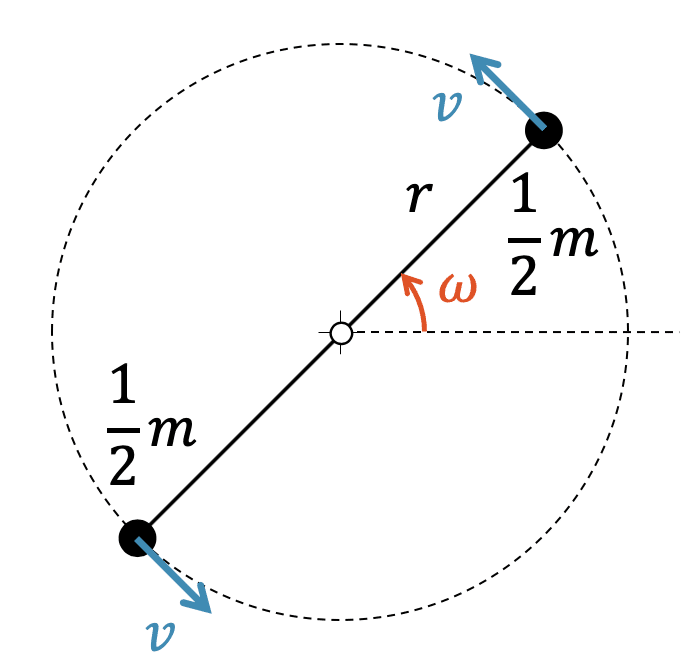 Betrachten wir deshalb die Masse \(m\) in zwei Punkte aufgeteilt, je mit der Masse \(\frac{1}{2}m\) ausgestattet und im Abstand \(r\) vom Drehzentrum.