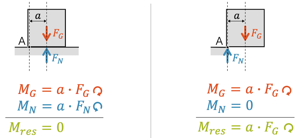 Schieben wir den Klotz über die Kante, so kann die Normalkraft zwar das Kräftegleichgewicht retten. Sie kann aber nicht verhindern, dass ein resultierendes Drehmoment entsteht.