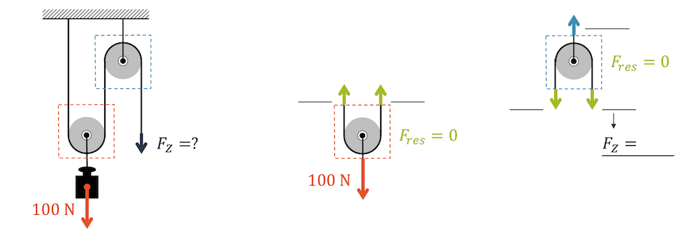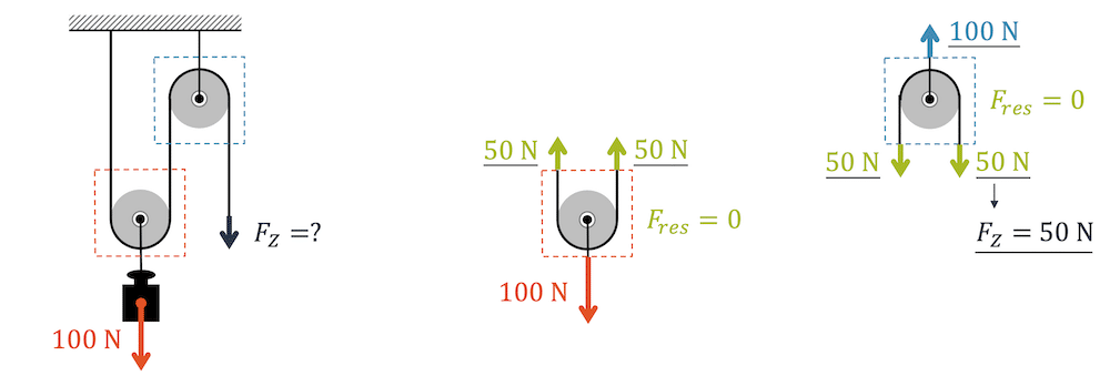 In der obigen Zeichnung sehen wir jetzt, dass wir zwei mal mit 50 N nach oben ziehen unten die Last mit 100 N nach unten zieht. Das System ist im Kräftegleichgewicht.