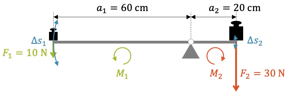 Durch die ungleichen Abstände würden sich auch die beiden Enden verschieden stark bewegen. Die Kraft \(F_1\) befindet sich am langen Ende, das sich dreimal stärker bewegt und somit einen dreimal längeren Weg \(\Delta s_1\) zurücklegt. Am anderen Ende wirkt die die dreimal grössere Kraft \(F_2\), jedoch über einen dreimal kürzeren Weg.