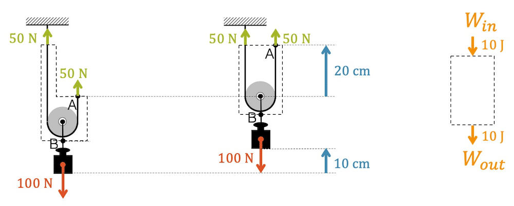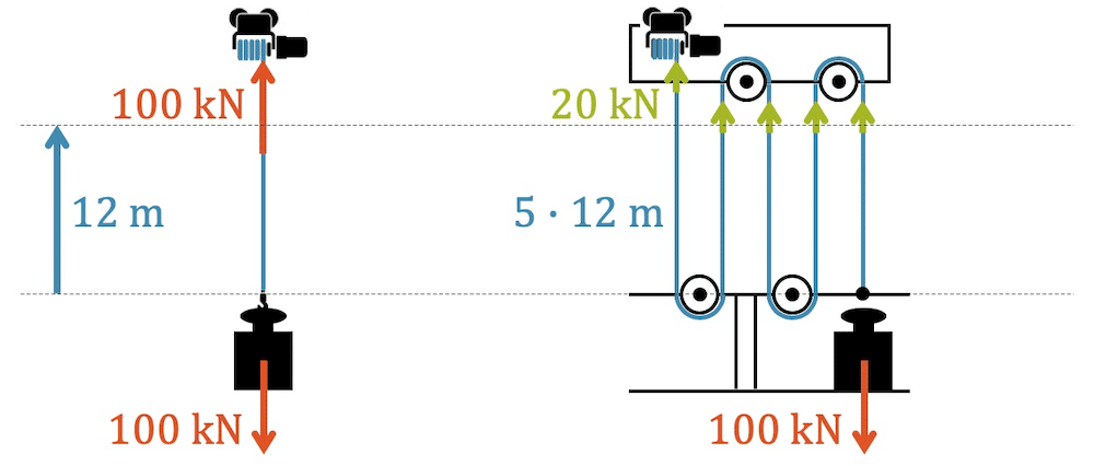 Der einfachste Flaschenzug hat nur gerade eine Rolle. Wir können einfach sehen, dass wegen des Flaschenzugs die doppelte Länge an Seil gezogen werden muss, um den gleichen Effekt beim Anheben zu erreichen.