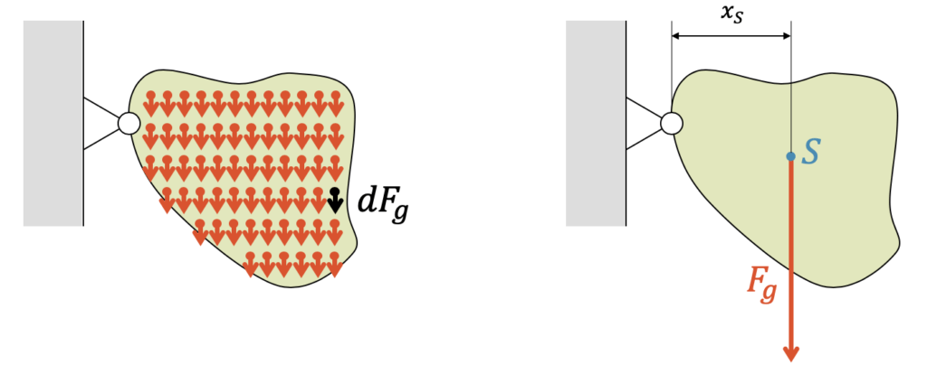 Wir erinnern uns nochmals an die Definition des Schwerpunkts: Er vereint die gesamte Masse und ist so platziert, dass er von überall gesehen das gleiche Drehmoment erzeugt, wie die im Körper verteilte Masse. Eine kleine Teilmasse erzeugt eine kleine Teil-Gewichtskraft \(dF_g\). Für den ganzen Körper müssen die Teil-Gewichtskräfte integriert werden und wir erhalten die Gewichtskraft: