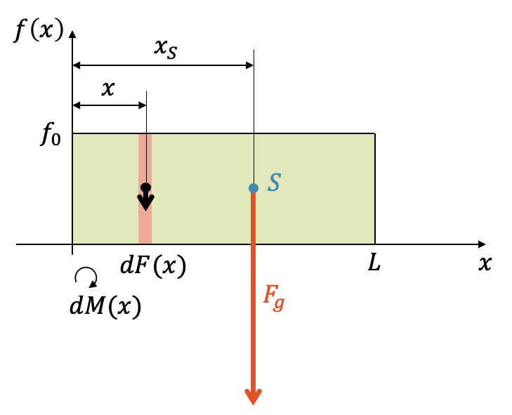 Je weiter diese Teil-Gewichtskraft vom betrachteten Drehpunkt entfernt ist (Abstand \(x\)), desto grösser ist das Teil-Drehmoment \(dM\). Für das Gesamt-Drehmoment aller Teil-Gewichtskräfte, müssen wir die Teil-Drehmomente integrieren. Dieses Integral muss dann aber das gleiche Drehmoment erzeugen, wir die gesamte Gewichtskraft \(F_g\) im Schwerpunkt, der im Abstand \(x_S\) liegt: