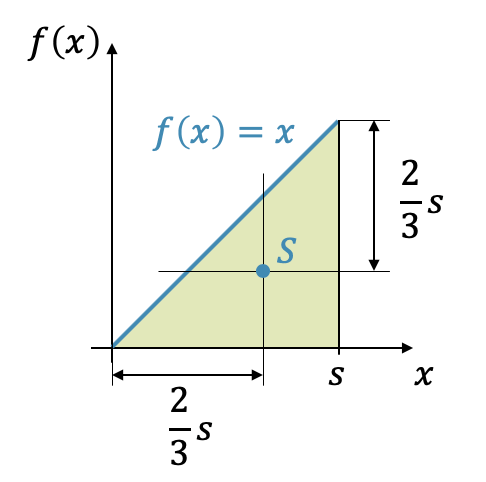 \[ x_S = \frac{\frac{1}{3}(s^3-0^3)}{\frac{1}{2}(s^2-0^2)} \]