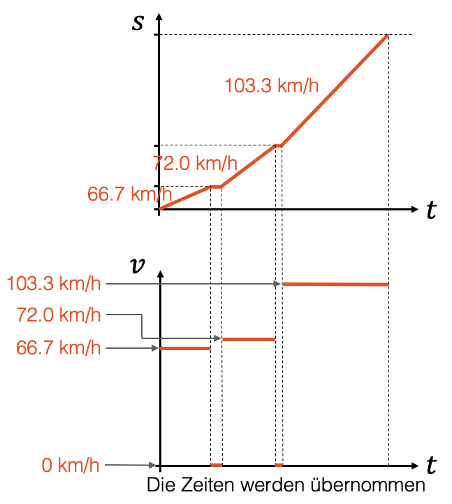 Ein v,t-Diagramm kann relativ einfach aufgrund eines gegebenen s,t-Diagramms erstellt werden. Um die zeitlichen Abschnitte vom einen auf das andere Diagramm zu übertragen, empfiehlt es sich das v,t-Diagramm unterhalb oder oberhalb des s,t-Diagramms zu zeichnen.