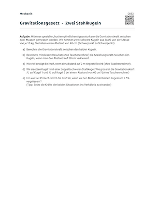 \[ F_G = G \cdot \frac{m_1 \cdot m_2}{r^2} \quad \quad \text{mit} \quad \quad G=6.674 \cdot 10^{-11} \; \frac{\text{m}^3}{\text{kg}\;\text{s}^2} \]