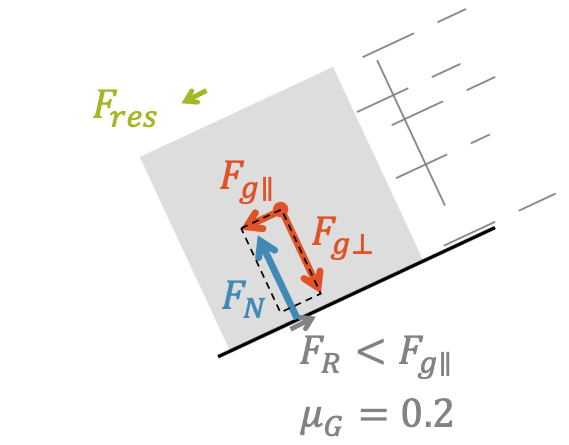 Die Kräftesituation ändert sich. Die Gleitreibung ist bei gleicher Normalkraft aber kleinerem Gleitreibungskoeffizienten \(\mu_G < \mu_H\) nun kleiner als die Haftreibungskraft. Dadurch verlieren wir das Kräftegleichgewicht, denn die Gleitreibungskraft ist kleiner als die Parallelkomponente der Gewichtskraft: \(F_R < F_{g \parallel}\). Wir haben jetzt eine resultierende Kraft \(F_{res}\), die den Klotz den Hang hinunter beschleunigt.