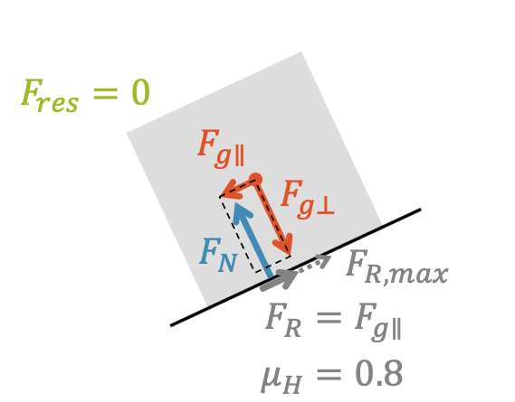 Sollten wir die \(F_{R,max}\) überschritten haben oder wurde der Klotz leicht bewegt, so fällt die Haftreibungskraft weg und wir wechseln zur Gleitreibung. Da der Gleitreibungskoeffizient aber kleiner ist als der Haftreibungskoeffizient (\(\mu_G < \mu_H\)), ist die Reibungskraft nicht mehr in der Lage das Kräftegleichgewicht zu halten. Die resultierende Kraft beschleunigt dann den Klotz den Hang hinunter.