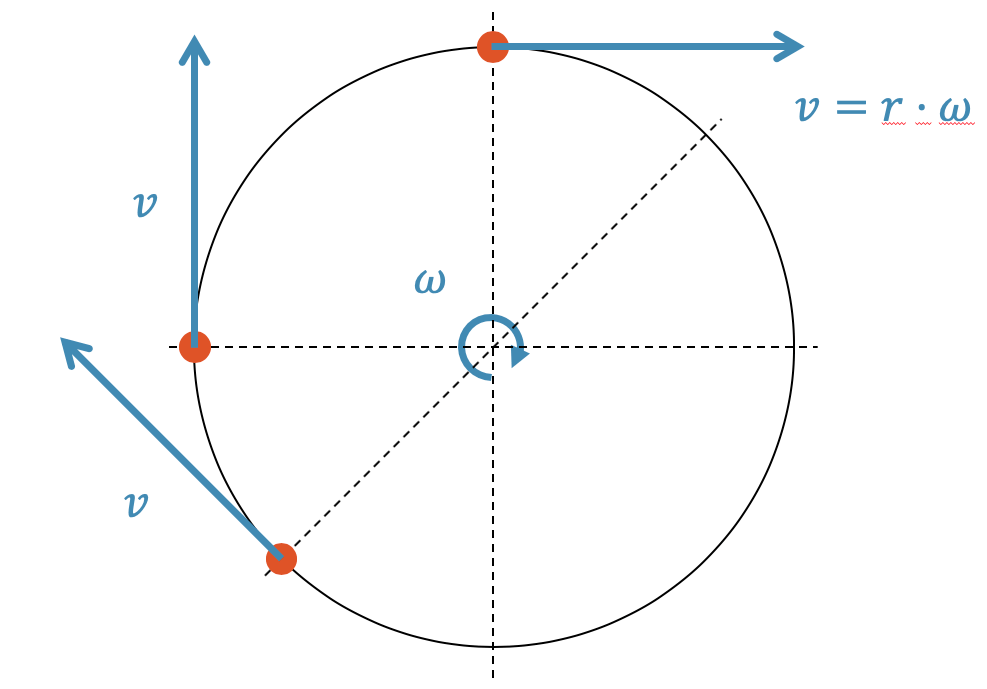 Die Bahngeschwindigkeit \(v\) ist abhängig vom Abstand \(r\) zum Drehzentrum. Sie nimmt linear mit dem Abstand (Radius) zu: Je grösser der Abstand, desto grösser der Umfang, desto grösser die Bahngeschwindigkeit.