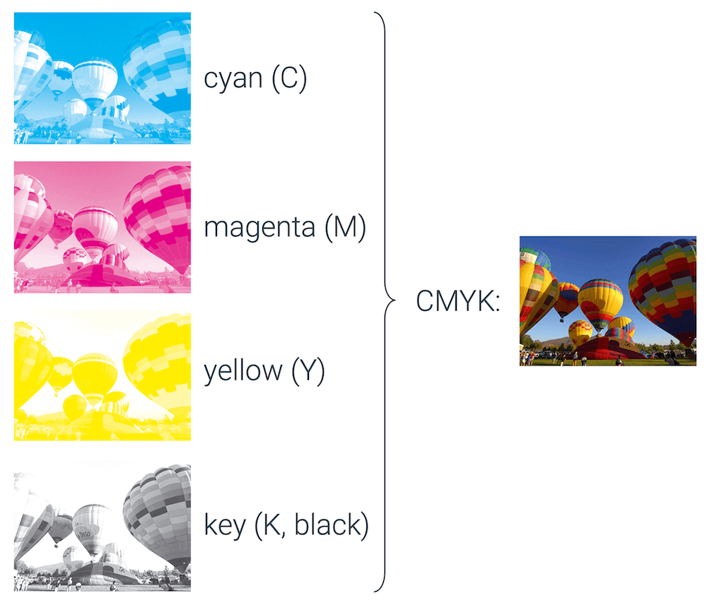 In der Farbdrucktechnik wird genau diese subtraktive Farbmischung verwendet. Mit den Farben \(C\), \(M\) und \(Y\) können alle Mischfarben erzeugt werden. Weil diese drei Farben zu schwach sind, um ein sattes schwarz zu erzeugen, werden zusätzlich schwarze Pigmente verwendet, die mit \(K\) für “key” abgekürzt werden. Damit haben wir die Farbkombination “CMYK” (sprich engl. “Si-äm-wai-key”).