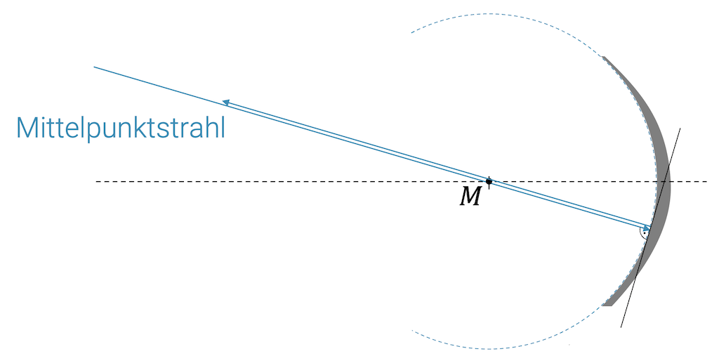 Deshalb können wir bei sphärischen Spiegeln die Mittelpunktstrahlen als Mittelpunktstrahlen zurück reflektieren lassen. Sie gehen genau dorthin zurück, woher sie gekommen sind.