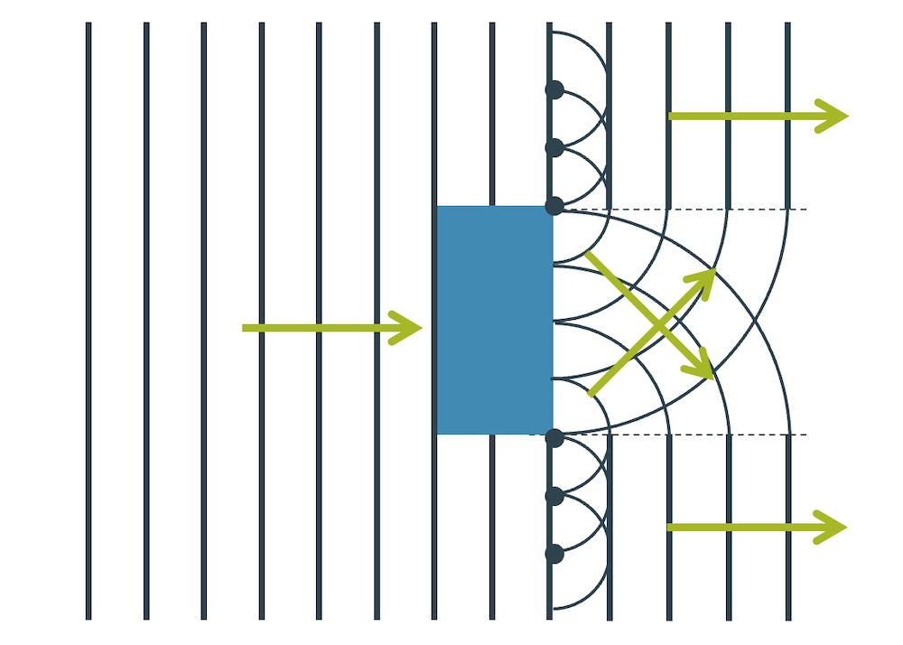 Analog sieht der Fall aus, wenn die Welle auf ein einzelnes Hindernis stösst. An beiden Seiten des Hindernisses führt die ebene Welle vorbei. Hinter dem Hindernis werden aber zwei Kugelwellen “sichtbar”, weil auf der einen Seite keine Elementarkugeln da sind, so dass die Umhüllende dort Viertelkreise bildet, statt der ebenen Wellenfront.