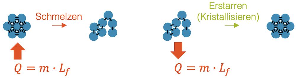 Für den Phasenübergang des Schmelzens braucht jedes Teilchen eine bestimmte Menge an Energie, um die Feststoffbindung zu überwinden. Die Energie, die für das Schmelzen eines Kiloramms des Stoffes gebraucht wird, heisst spezifische Schmelzwärme \(L_f\).