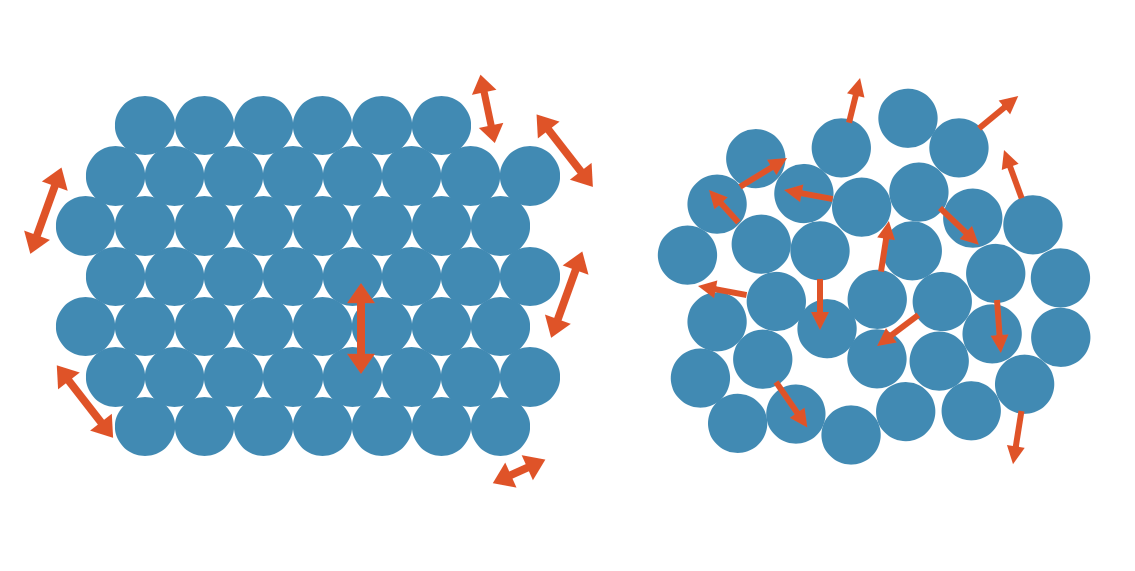Wenn einem Feststoff Wärme \(Q\) zugeführt wird, dann nimmt die Temperatur zu. Sobald der Feststoff aber anfängt zu schmelzen, wird die zugeführte Wärme für das Aufbrechen der Feststoffbindungen gebraucht. Die Temperatur bleibt konstant, bis das letzte Kristall geschmolzen ist. Dann führt die weiterhin zugeführte Wärme \(Q\) wieder zu einer Temperaturerhöhung der Flüssigkeit.