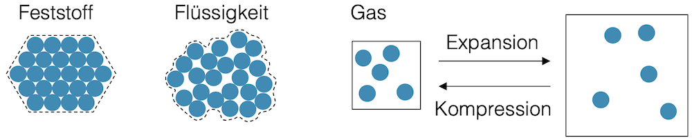 Bei einem Feststoff oder einer Flüssigkeit ist die Dichte eigentlich immer etwa gleich, weil für einen Stoff eine bestimmte Anzahl Teilchen immer etwa gleich viel Platz einnimmt. Gemäss Teilchenmodell sind die Teilchen nahe zusammen, d.h. wir haben ein Feststoff-Partikel oder einen Flüssigkeits-Tropfen.