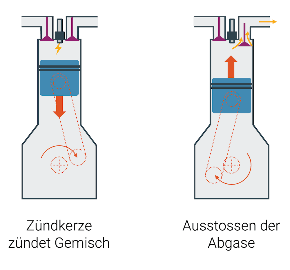 Viertakt-Motor (Otto-Kreisprozess): Im dritten Takt zündet die Zündkerze das Gemisch. Im vierten Takt werden die Abgase ausgestossen.