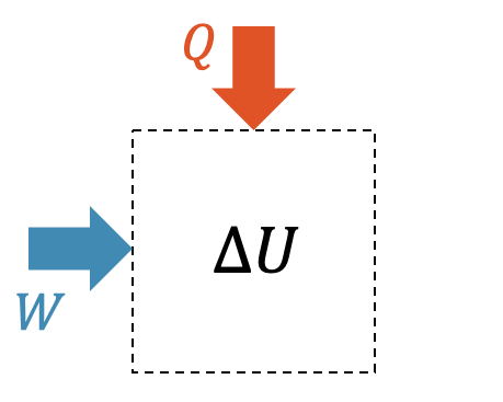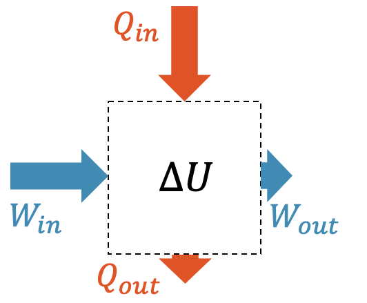 \[ \Delta U = \big( W_{in} – W_{out} \big) + \big( Q_{in} – Q_{out} \big) \]
