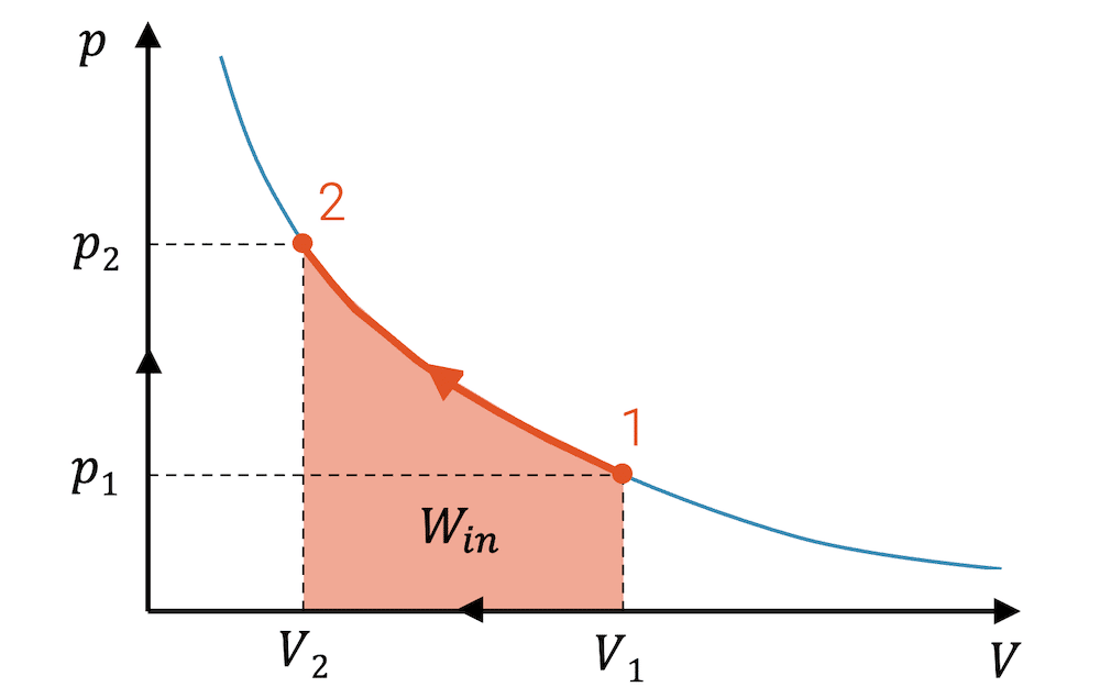 Bei einer beliebigen Zustandsänderung, bei welcher das Fluid komprimiert wird, entspricht die Fläche unter der Linie der Zustandsänderung im p-V-Diagramm der eingebrachten Kompressionsarbeit \(W_{in}\), die am Fluid dafür verrichtet worden ist.