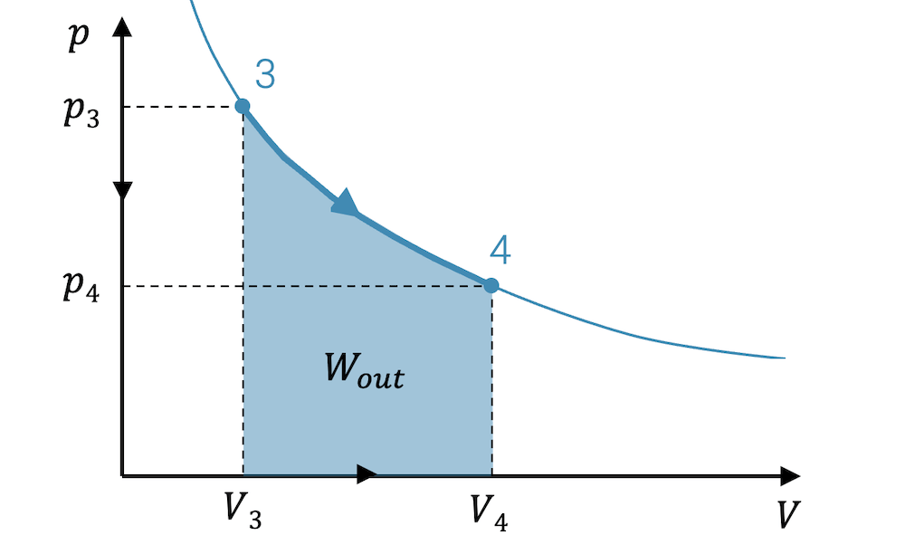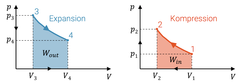 Wenn wir vom Zustand 3 zum Zustand 4 expandieren, bewegt sich der Punkt entlang der Kurve der Zustandsänderung. Addieren wir unendlich viele Rechtecke auf dem Weg von 3 nach 4, erhalten wir die Fläche unterhalb der Kurve der Zustandsänderung. Diese Fläche entspricht der Summe aller kleinen Arbeitsbeiträge, d.h. in Summe die Arbeit, die bei der Expansion das Fluid abgibt.