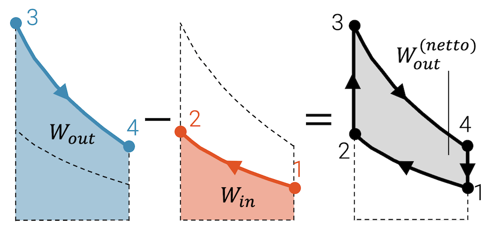 Wenn mehr Arbeit abgeführt als eingebracht wird, dann ist das energetisch eigentlich nicht möglich oder nicht nachhaltig. Allerdings werden ja in den Zustandsänderungen 2 \(^\rightarrow\) 3 und 4 \(^\rightarrow\) 1 Wärme aufgenommen bzw. abgegeben. Insgesamt muss die Bilanz der Energieströme stimmen und die Wärmekraftmaschine muss gleich viel Energie aufnehmen, wie sie abgibt. Die eingeschlossene Fläche zeigt uns aber die wichtigste Grösse der Wärmekraftmaschine, nämlich wie viel Arbeit sie abgibt. Das ist nämlich auch ihr Job. Wärmekraftmaschinen dienen dazu, Arbeit abzugeben, die sie zuvor in Form von Wärme aufgenommen haben.